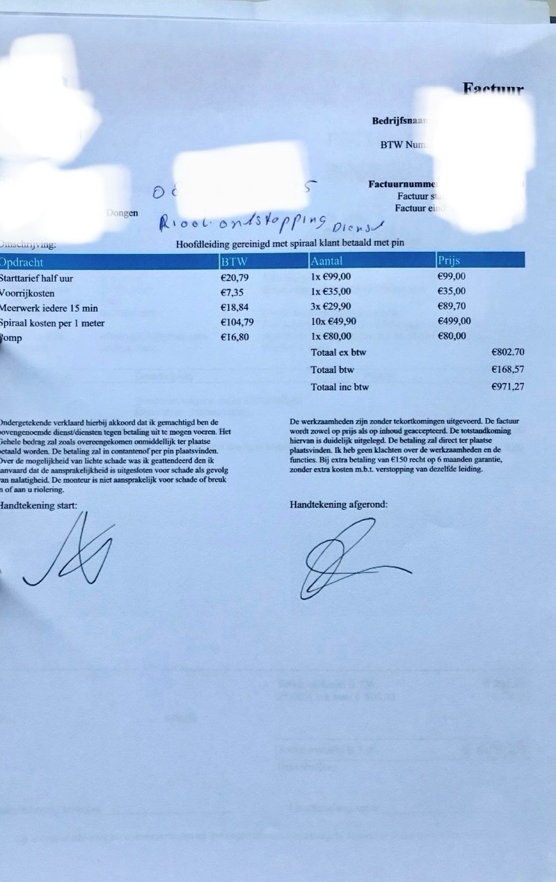 - Materiaalkosten: ± €10 per meter (bijv. voor ontstoppingsveer of hogedrukreiniger)